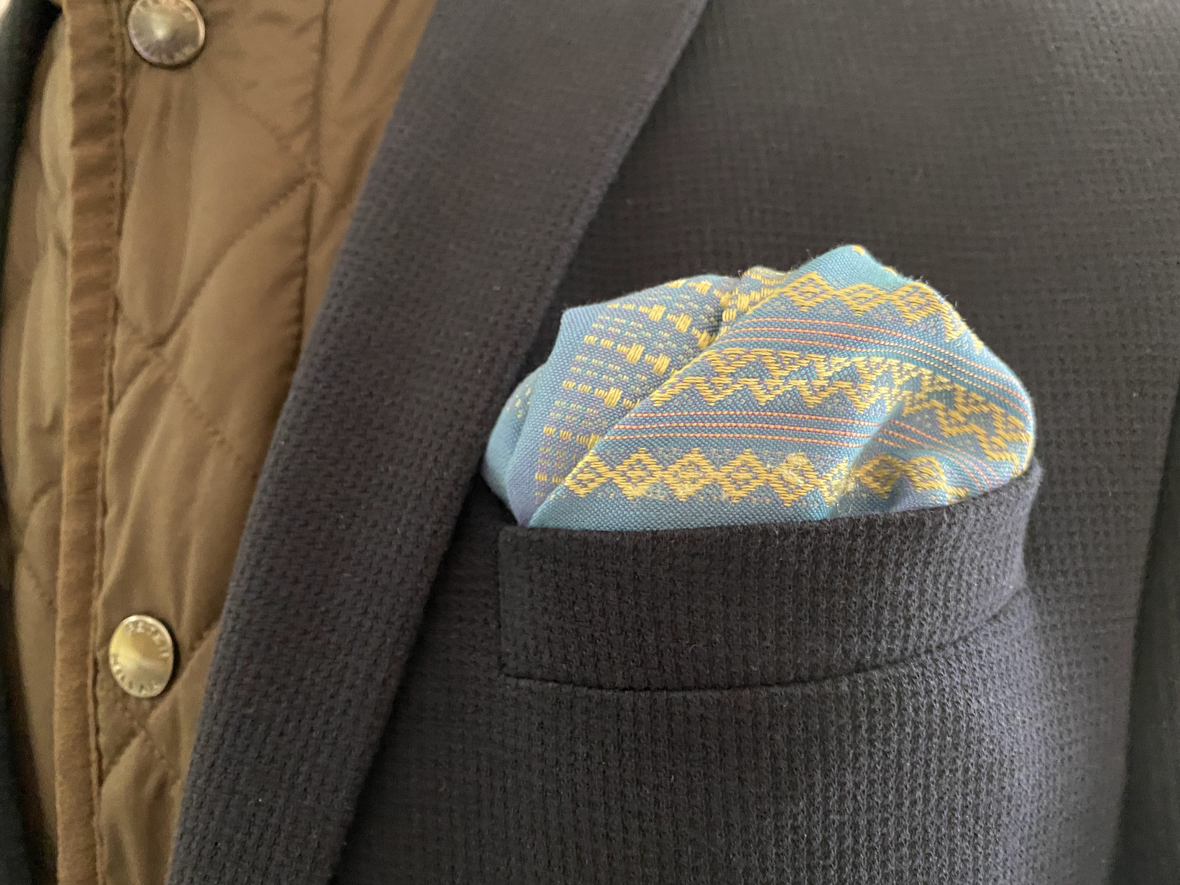 Thai Light Blue and Gold hand sewn Pocket Square was originally a pillow case from Thailand.